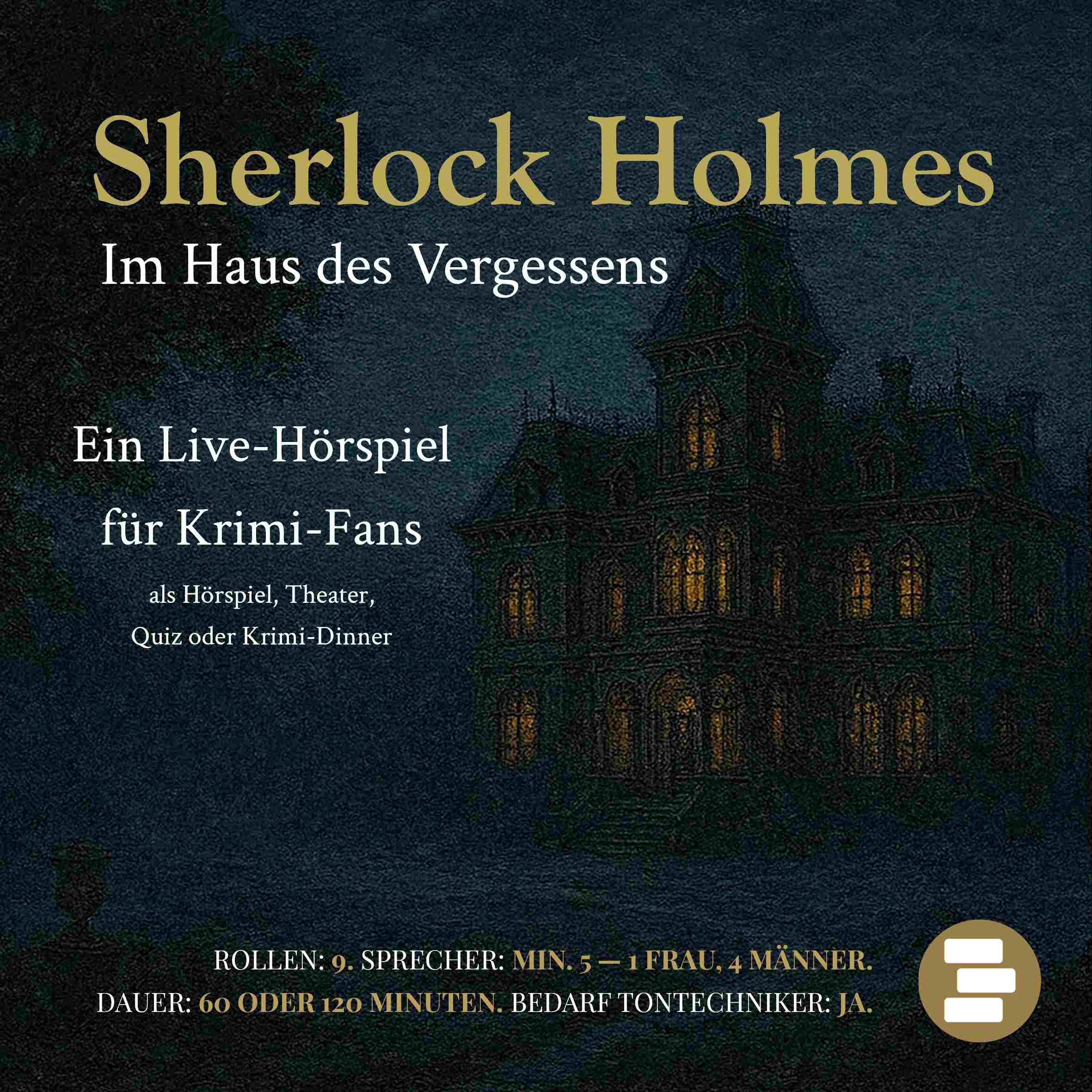 „Sherlock Holmes im Haus des Vergessens“ ist ein Live-Hörspiel für Krimi-Fans mit neun Rollen, die von mindestens fünf Sprecher:innen gesprochen werden müssen, davon 4 männlich und 1 weiblich. Das Stück kann als Live-Hörspiel, Theaterstück, Krimi-Dinner oder Quiz-Show aufgeführt werden. Die Aufführungsdauer des Stücks beträgt 60 Minuten als Live-Hörspiel oder Theater und 120 Minuten als Krimi-Dinner oder Quiz-Show.