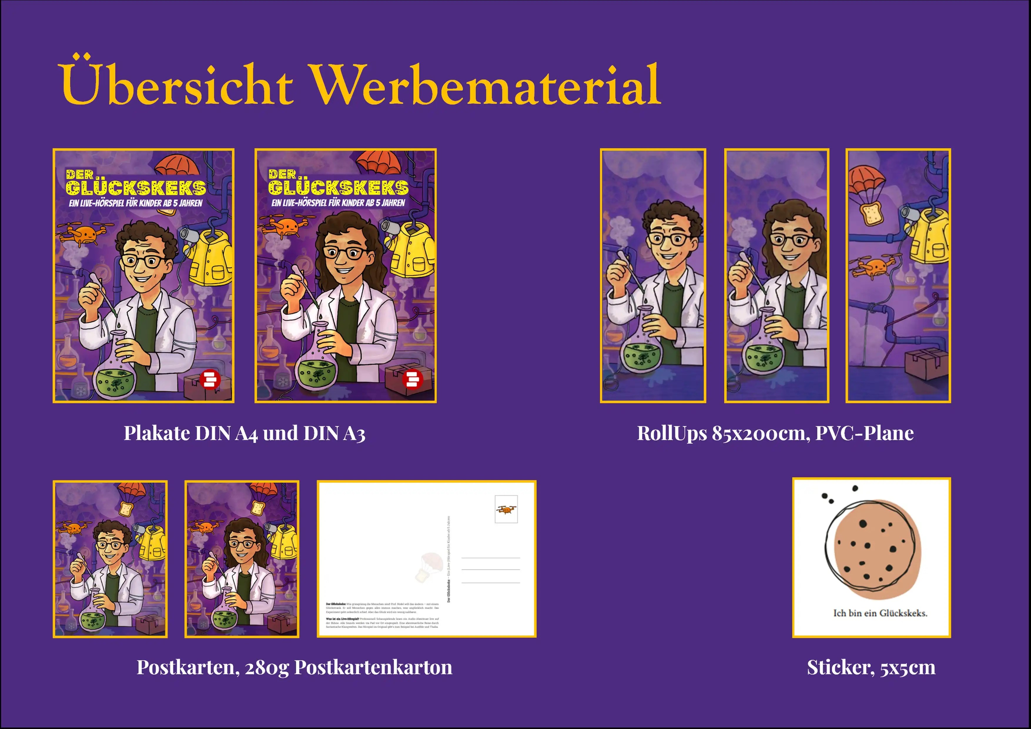 Hier gibt es Werbematerial zur Aufführung unseres Live-Hörspiels „Der Glückskeks“: Plakate, RollUps für die Bühne sowie Postkarten und den Sticker „Ich bin ein Glückskeks“ als GiveAways. Nach Ihrer Bestellung erhalten Sie eine Rechnung von uns. Die bestellten Waren erhalten Sie dann in der Regel binnen 14 Tagen nach Zahlungseingang.